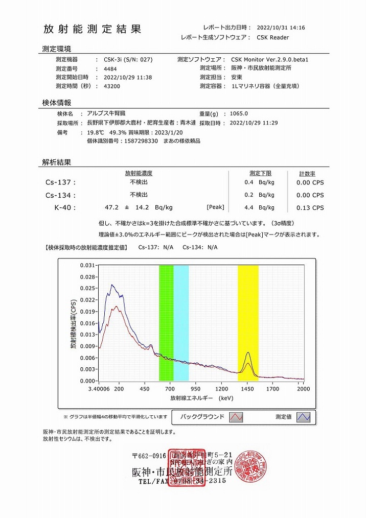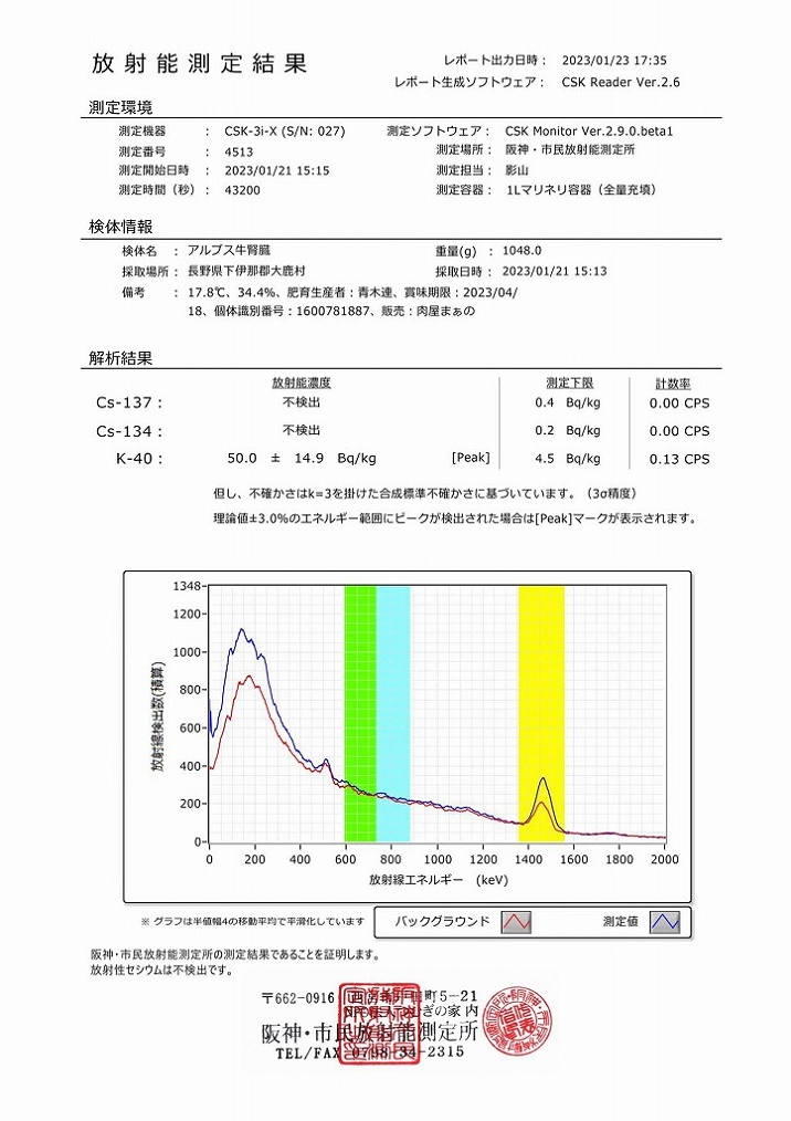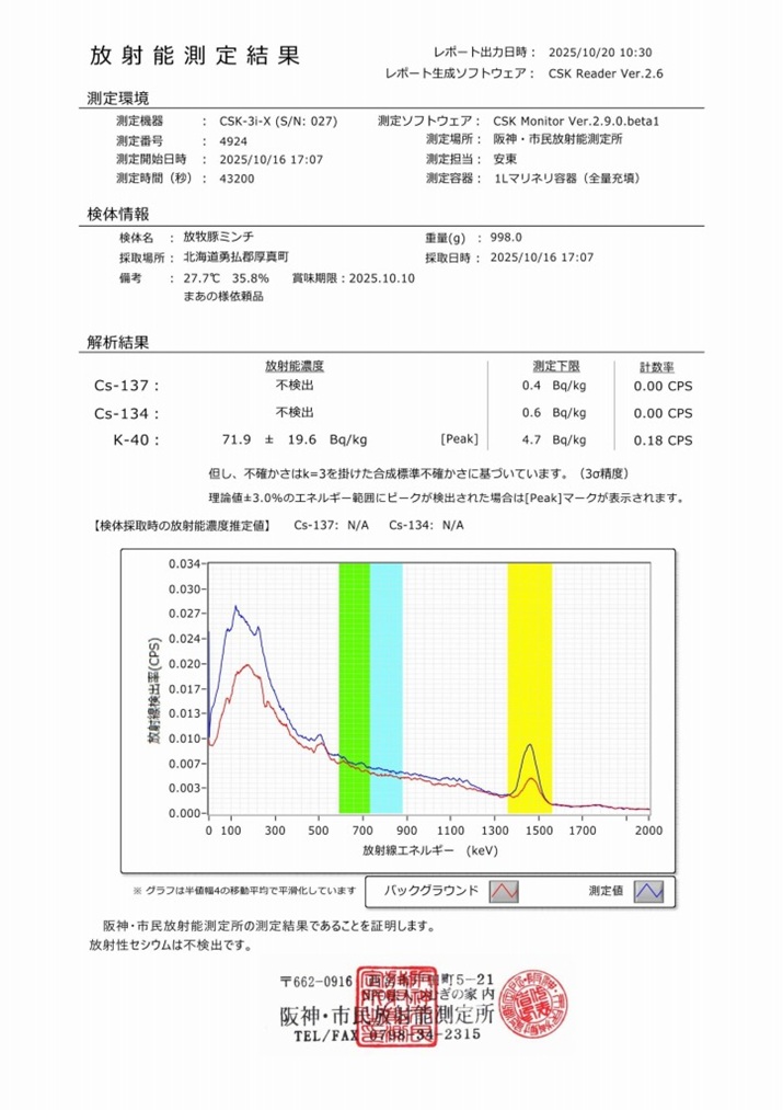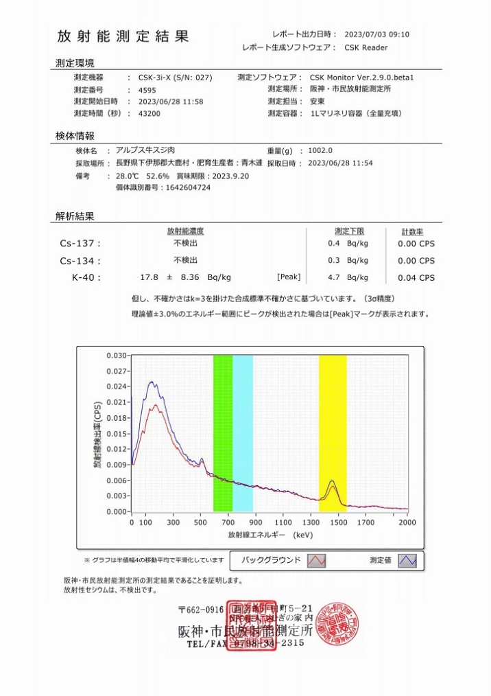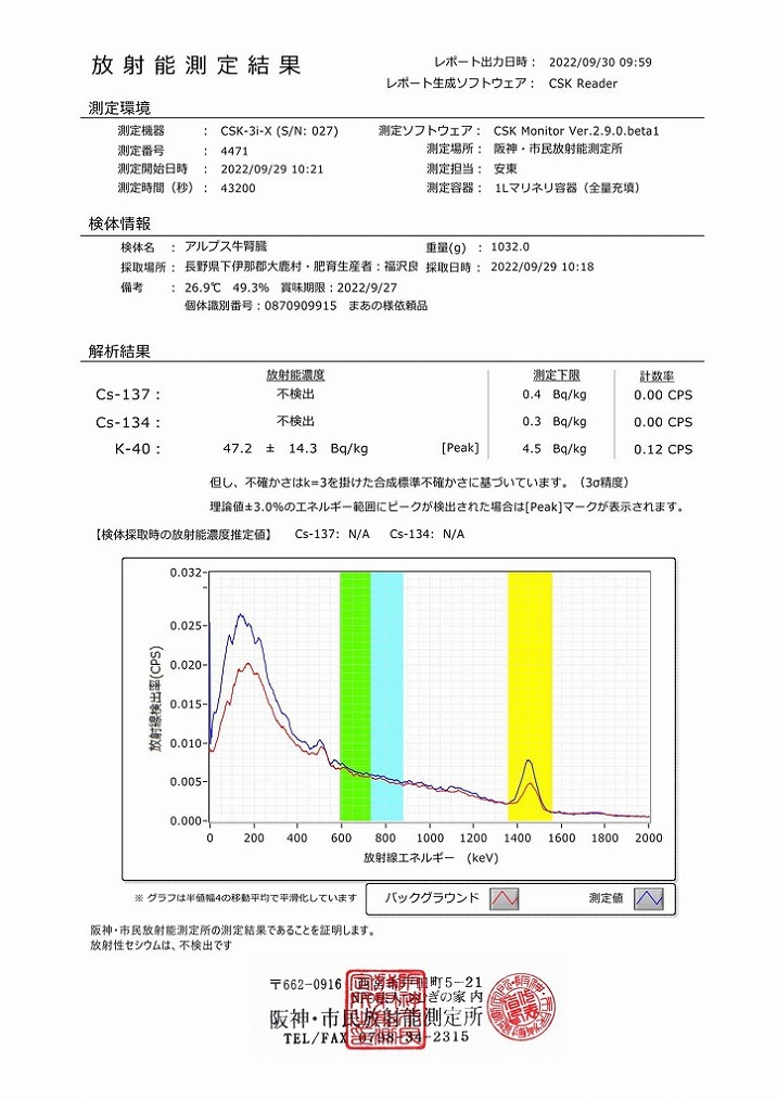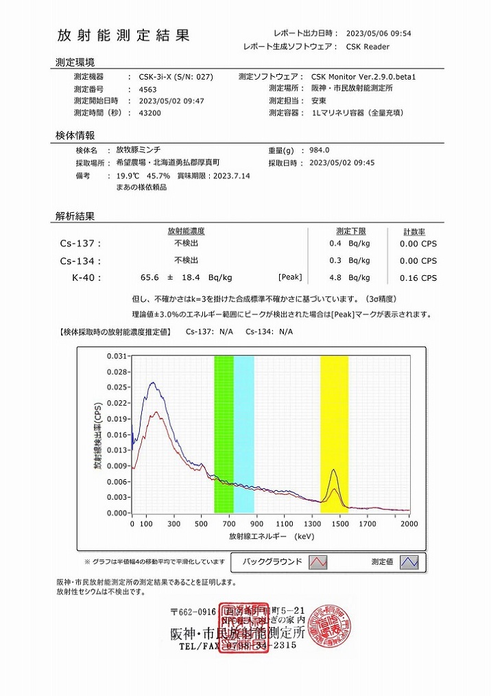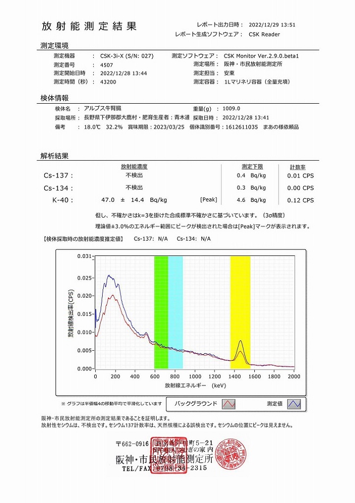 現在お肉は阪神・市民放射能測定所で定期的に放射能検査をしています。