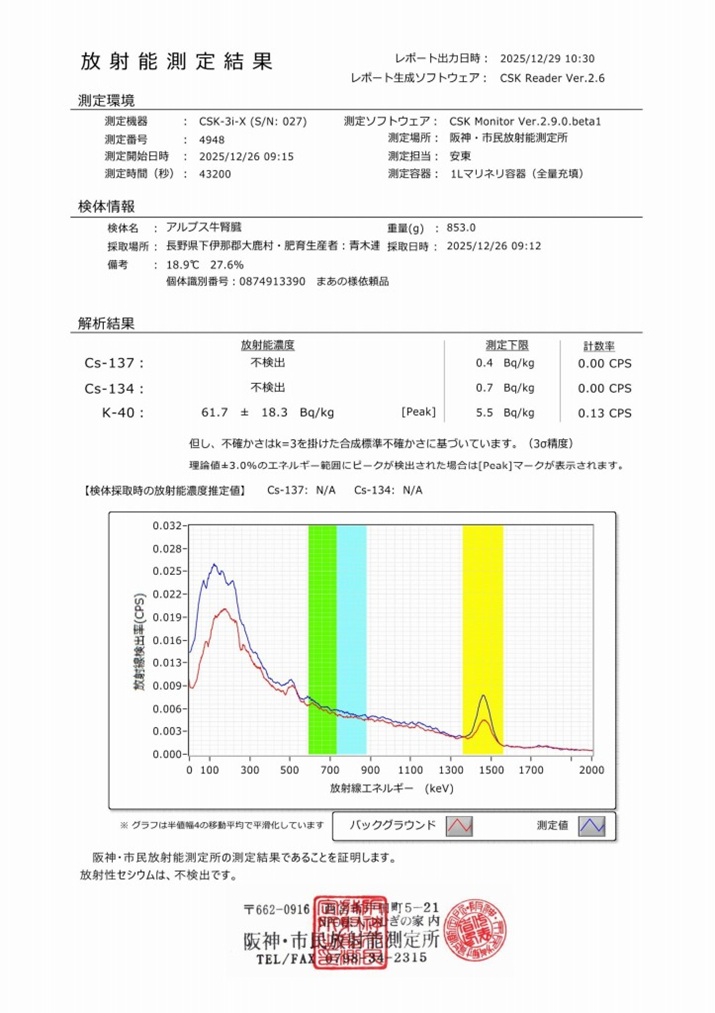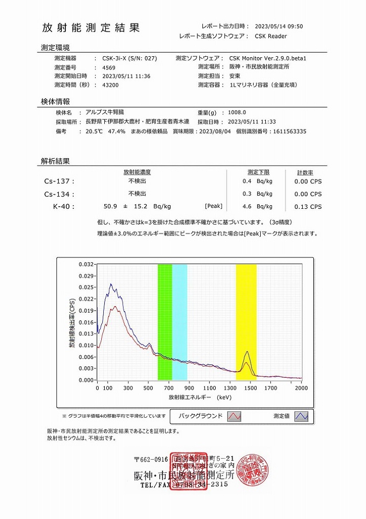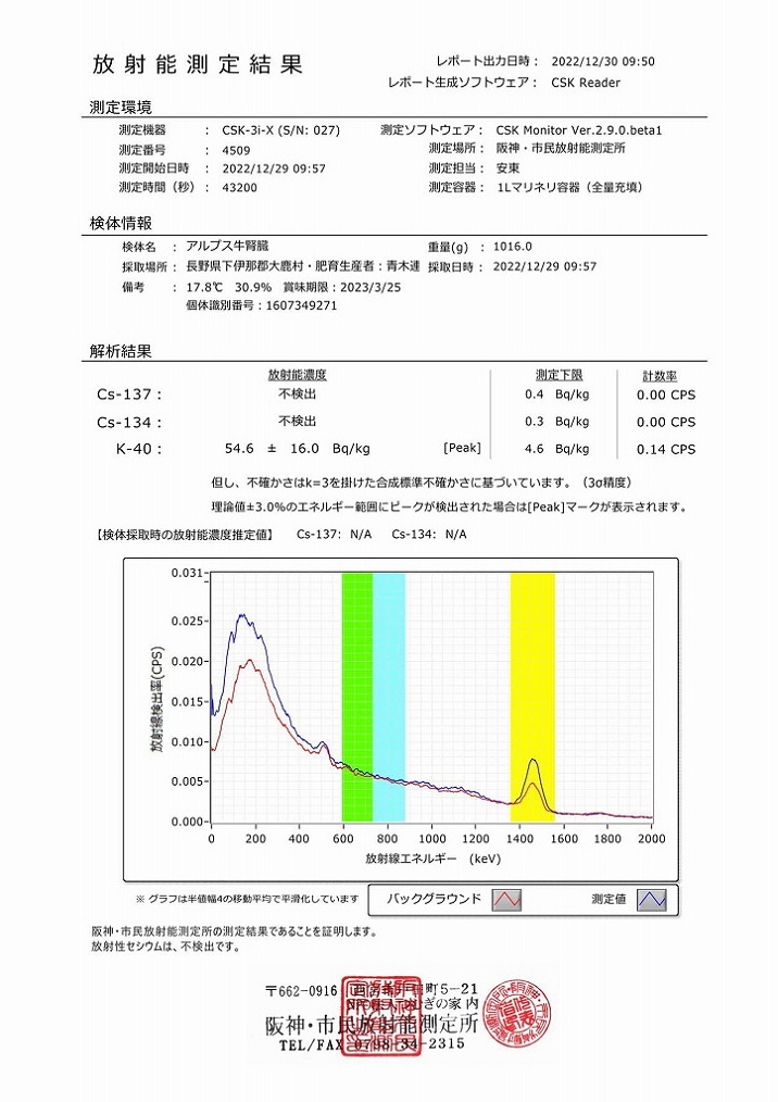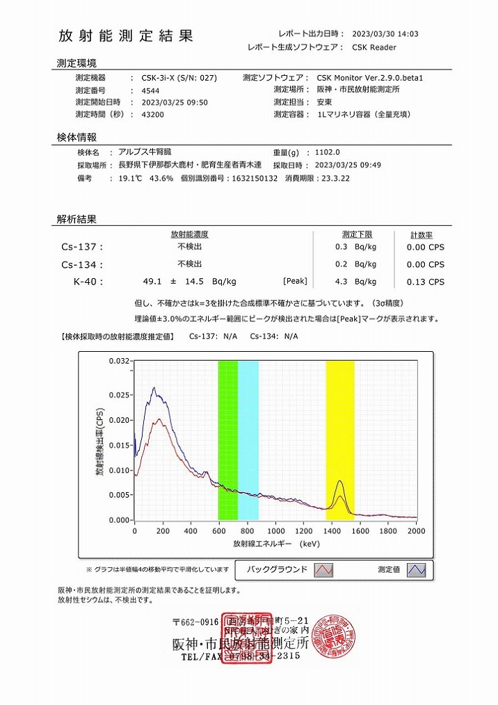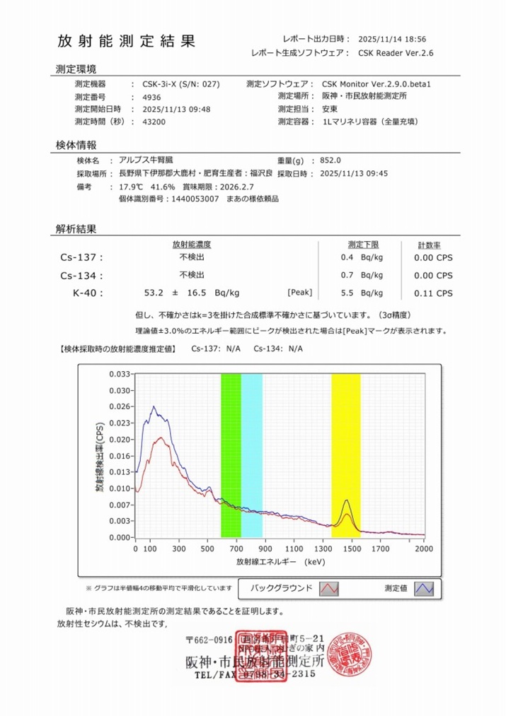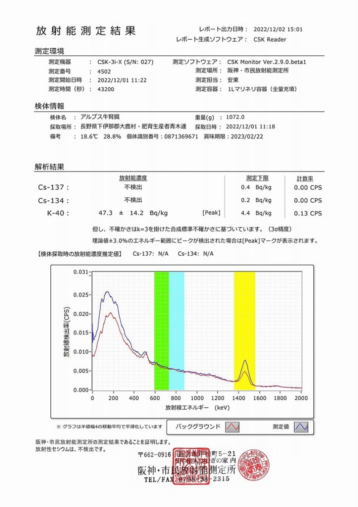 現在お肉は阪神・市民放射能測定所で定期的に放射能検査をしています。