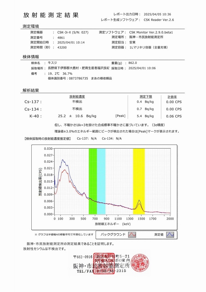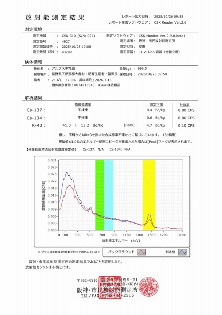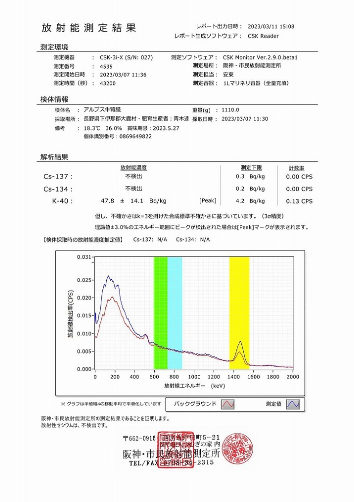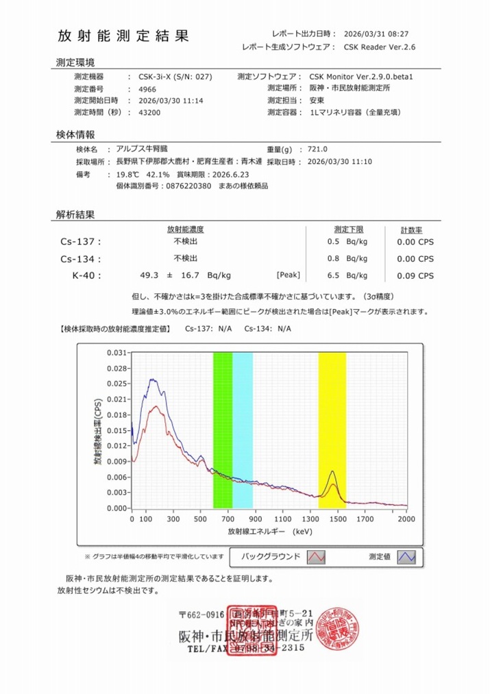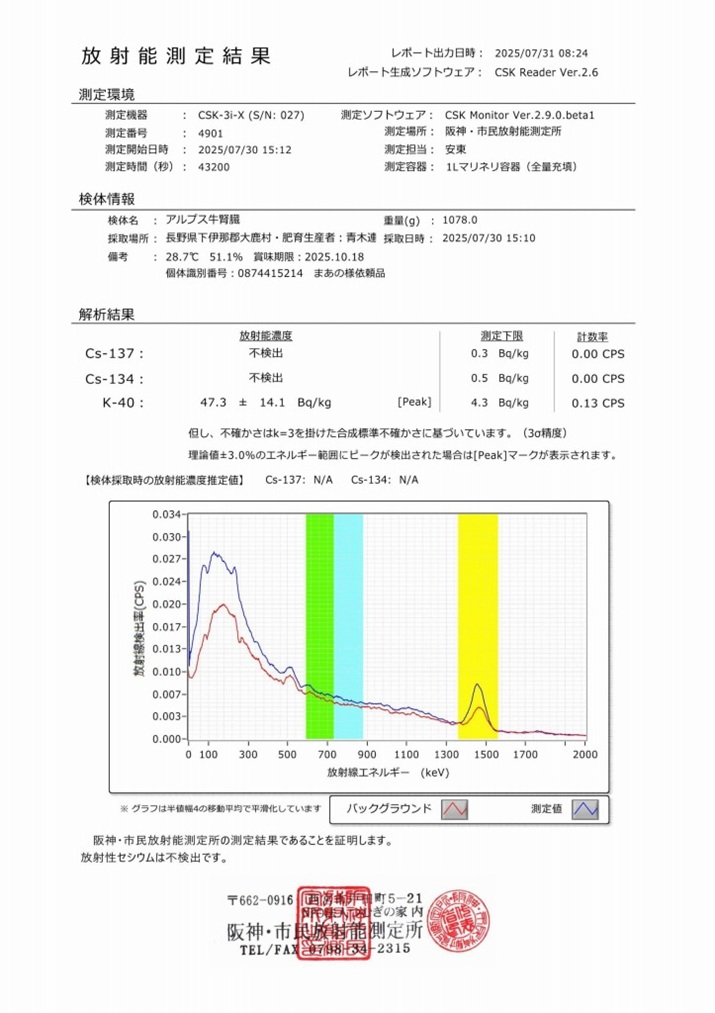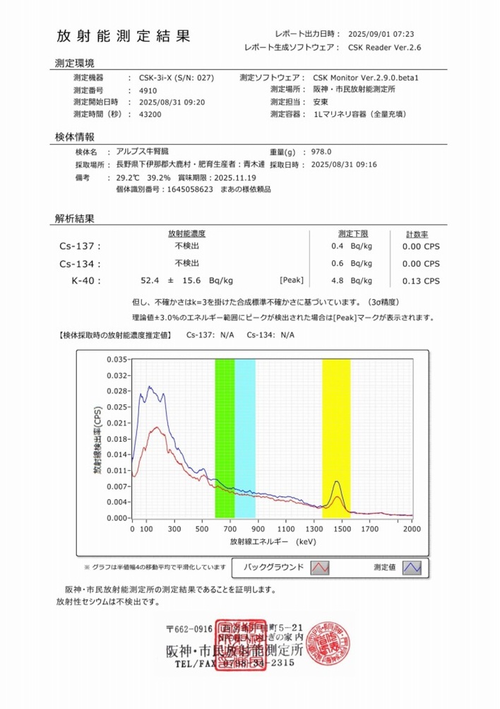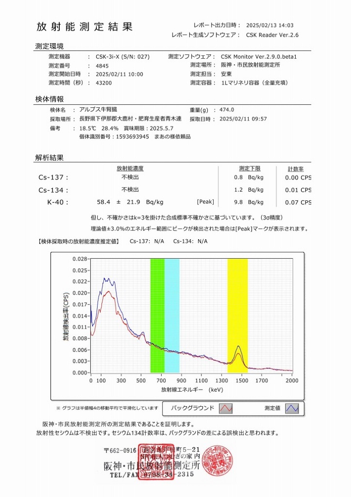 現在お肉は阪神・市民放射能測定所で定期的に放射能検査をしています。