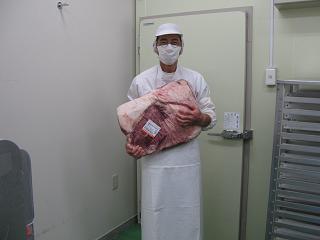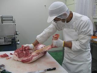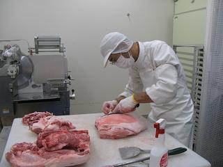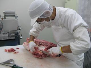 牛のパーツはさすがに大きく、写真の「クラシタ」は20kg近くあります。 整形では、筋を引き、脂を削り、残骨をチェックし、その後のスライスやカットに使いやすいよう形を整えます。 |