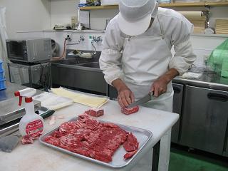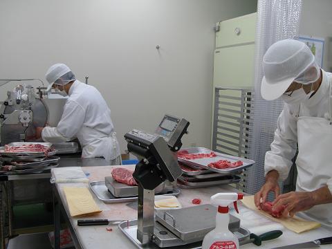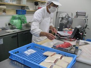 日常は、小村幸治がお肉の整形とスライス・カットを行い、つれあいの幸子がお肉のパック・発送などを担っています。 |