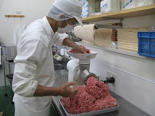 | ミンチはチョッパーという機械で作ります。パーツ肉を整形して出てくる整形くずと、チマキと呼ぶスネ肉やネックなどを混ぜてミンチ材料を作ります。 |
