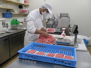 | 生肉を扱う肉屋として,心がけていることは二つあります。 一つは温度管理です。肉は高温にさらされるとあっという間に雑菌が繁殖してしまいます。仕事場は冬を除きエアコンで16℃設定しています。加工した肉はすぐに冷蔵庫に戻します。 |