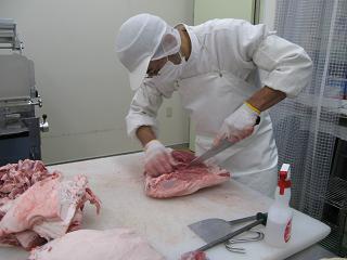 | 豚は牛に比べると5分の1くらいの大きさですが、それだけに細かい整形が必要です。冬は特に脂が乗って美味しそうですが、表面は5ミリから1センチくらいまで大量に脂を削らないといけません。 | |