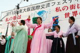 個人的な感想ですが、次回というか、いつかに、こんなことができたらいいなと思うことがあります。 それは、いつもフェスティバルのトリとしてオモニたちの歌うアリランやオナラに合わせて、舞台の回りではみんなも参加して、賑やかに肩踊りが繰り広げられます。夢は、このトリの際に参加者全員で行う何千人規模の肩踊りの実現です。 無理は承知で、そんなことを夢見ながら、11回目のフェスティバルの報告とします。 |